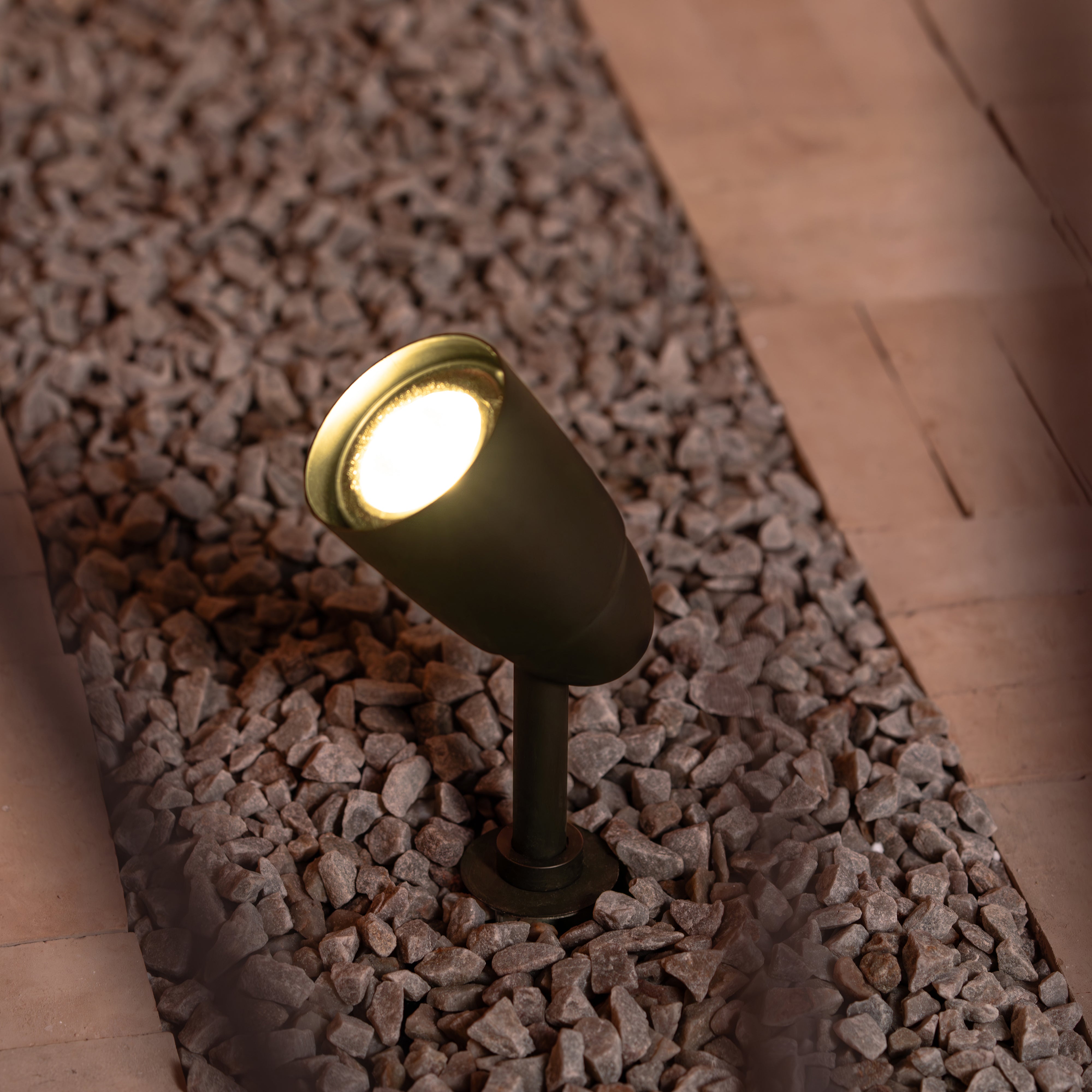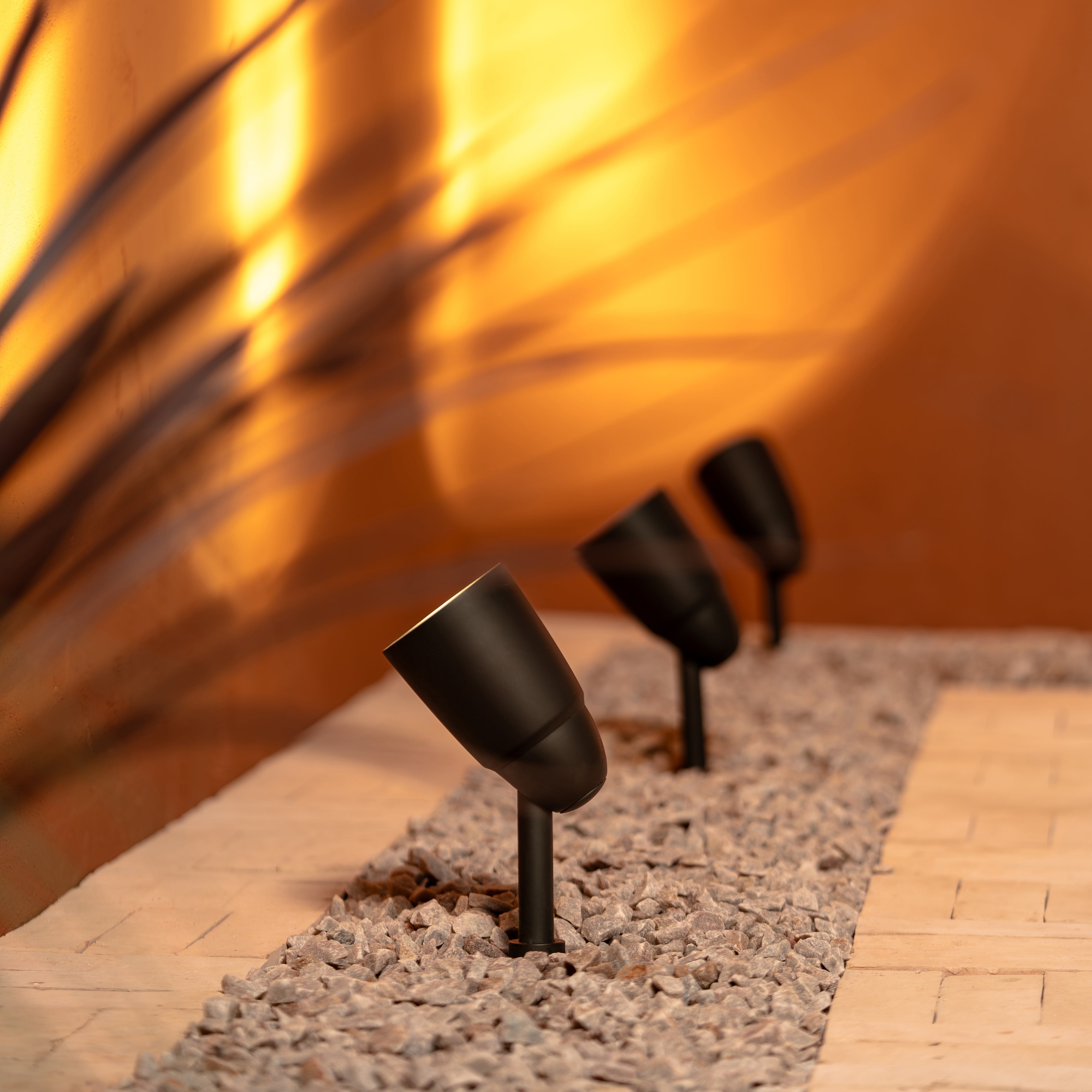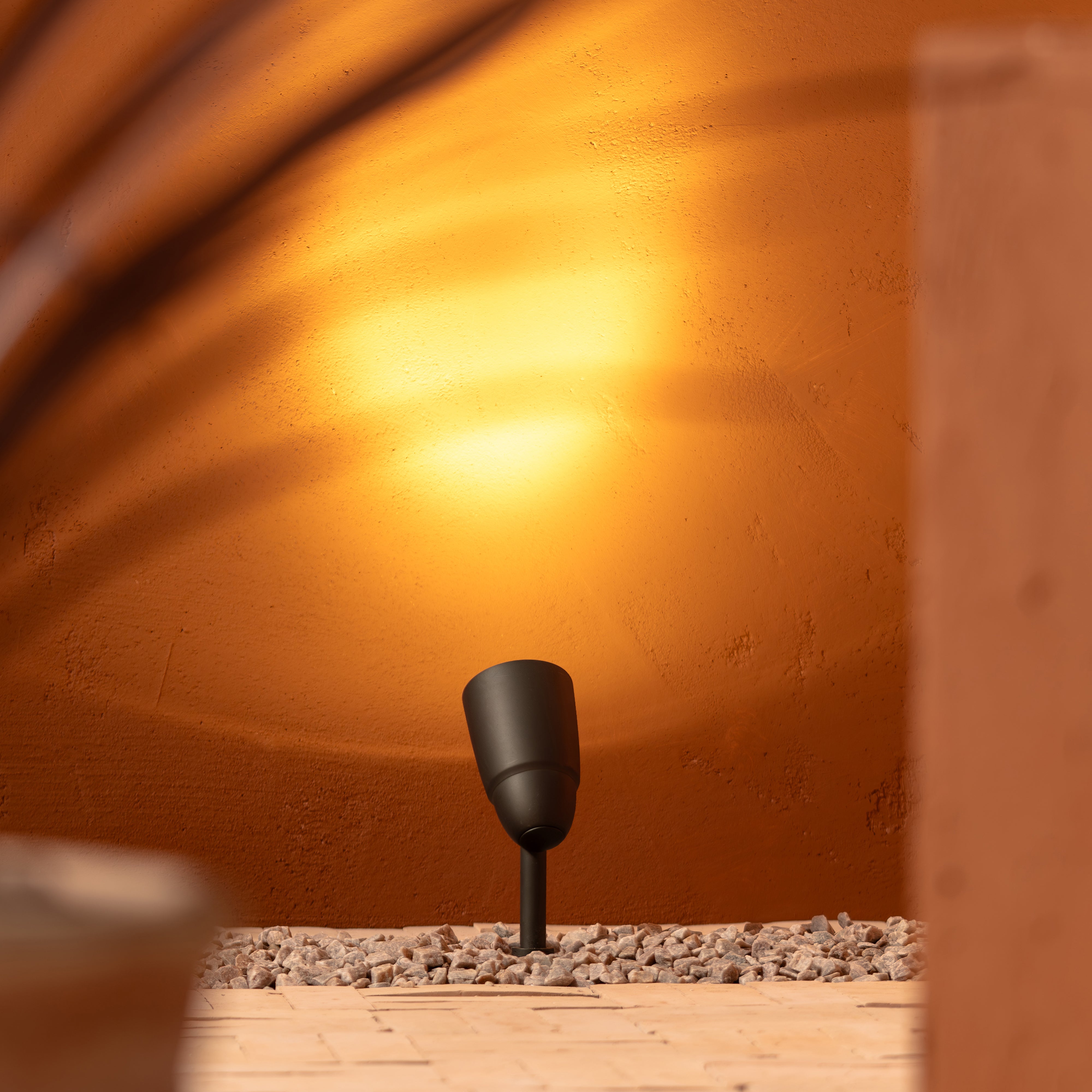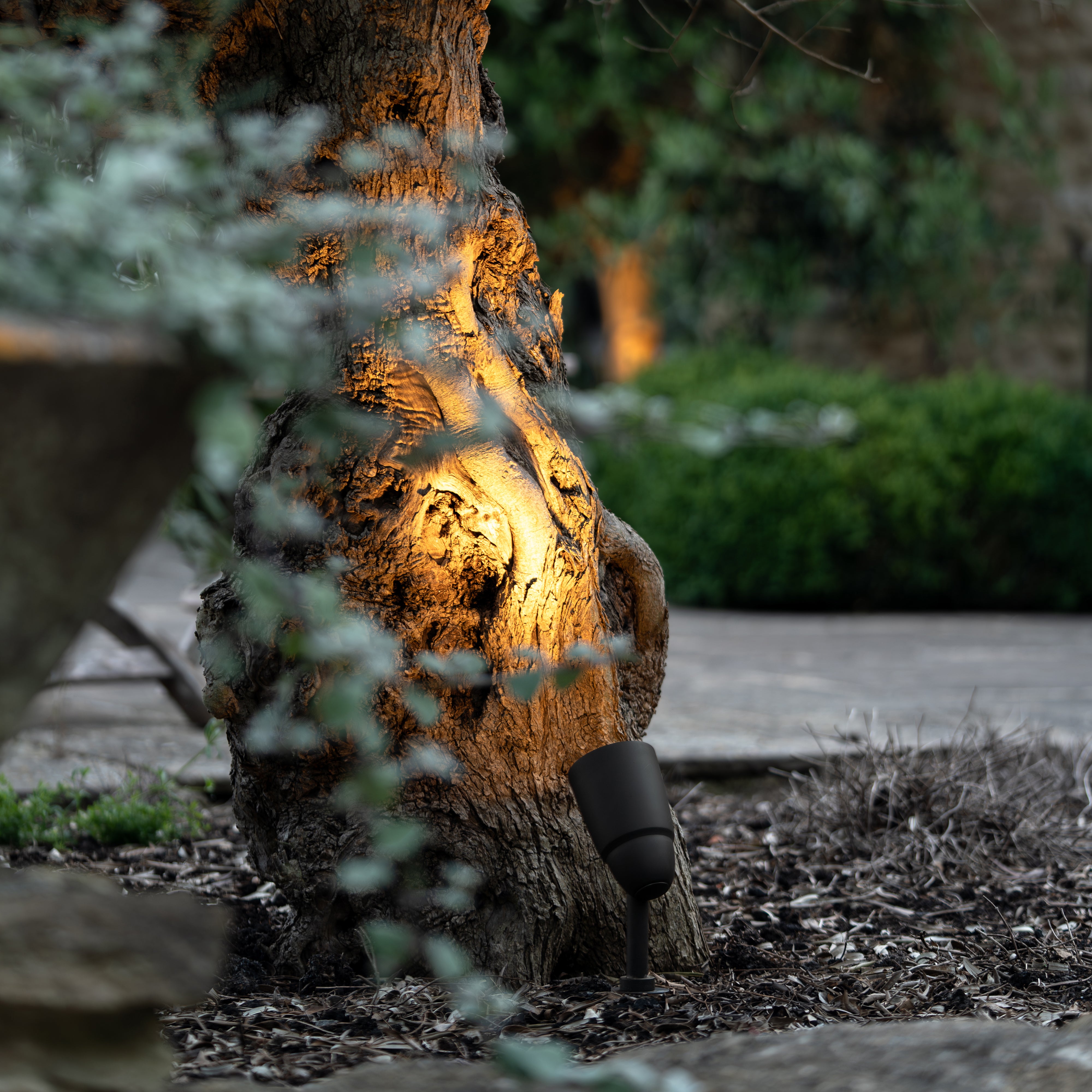 Der Bodenstrahler Ealing beleuchtet Bäume, Gartenelemente oder Außenwände von unten.